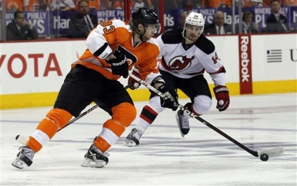 The Flyers tied the game in the second period, as Jake Voracek fed Danny Briere with a beautiful long-ice pass that he corralled for a breakaway on Marty Brodeur. The Devils’ defense of Peter Harrold and Anton Volchenkov were caught pinching too far deep.