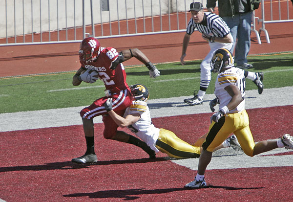 I think the thing you have look for in wide receivers is the freakish factors.  That's the case with Indiana's James Hardy.  The dude is 6'7", weighs 217 and runs a 4.5 forty yard dash.  It'll be hard for any DB in the league to matchup against him.