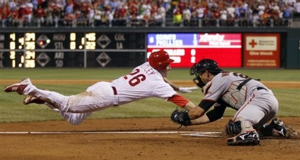 Let’s take a look back at the play. As soon as the ball cracked off of Utley’s bat, he busted his hump down the line, which should come as no surprise because he busts it every time he puts the ball in play, whether it be a home run or a tapper back to the mound. He sees the ball roll away from the centerfielder and puts it into second gear. We then see him approach third base gritting his teeth with a sheer look of determination on his face. This was my favorite part of the play because you could clearly see that “get out of my way, nothing is stopping me” attitude on his face. He was not going to be denied. The superhero dive to elude the tag and touch home plate was the icing on the cake.