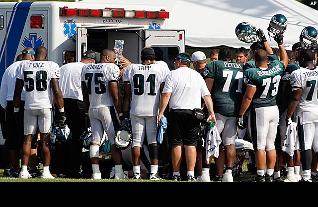 Eagles defensive tackle Mike Patterson was taken off the field after collapsing and having convulsions. He was taken to Lehigh Valley Hospital where he has reported recovered after suffering from dehydration.