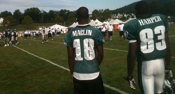 i am not sure how big this Harper kid is standing next to Maclin, but MAclin looks like a High School player standing next to him and what really sucks is that Maclin finally overcame he fear of contact last season and was really blossoming into one of the top all-around WR’s in the NFL.. If he’s not 100% and 10-15lbs lighter and goes back to being a little gun shy because of it, It may take him 2 years to get back to the point where last season where he finally overcame the “deer in the headlights” look he had as a Rookie.. Most important is his health and I wish him a full and speedy recovery but If I am the EAgles, I was looking at the Waiver wire to bring someone in for I see Maclin on th ePUP list and not eligible to play until week #5/#6..(maybe bring in a TJ Houzhmazada for a short-term fix..) If Maclin is unable to play, then teams simply double D-Jax (with a Defender in front of DJ and a defender over the top and basically take him out of running free and on any deep routes) and than that leaves who else to hurt you.. Avant/Cooper are more possesion type of receivers and are not going to run away from coverage..S Moss has had a nice camp and maybe he can be that guy…