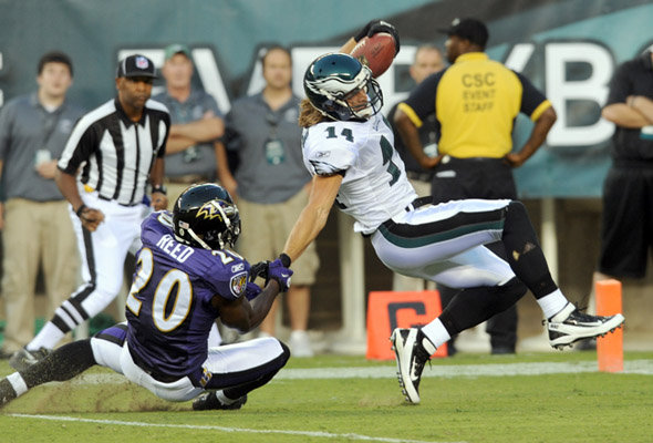 -Riley Cooper: The second year wide receiver found room against Ed Reed and made an acrobatic catch to put the Eagles at the two yard line. Vick’s strike with the former Gator was Cooper’s first pass since the interception against Green Bay that eliminated the Eagles from the playoffs…After seeing the 42-yard reception; I’d say Vick and Cooper’s chemistry is just fine.