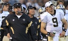 New Orleans Saints head coach Sean Payton, left, and quarterback Drew Brees (9) watch from the sidelines in the third quarter of a preseason NFL football game against the Oakland Raiders in Oakland, Calif., Sunday, Aug. 28, 2011. (AP Photo/Marcio Jose Sanchez)