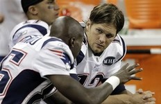 New England Patriots quarterback Tom Brady, right, listens to Chad Ochocinco on the bench during the second half of an NFL preseason football game against the Detroit Lions in Detroit, Saturday, Aug. 27, 2011. (AP Photo/Paul Sancya)