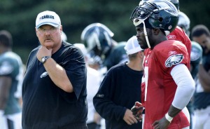 Coach Andy Reid instructs Mike Vick at Eagles practise at Lehigh Friday. ///////\\\ SEE NICK FIERRO STY DONNA FISHER/THE MORNING CALL BETHLEHEM Pic made FRIDAY, AUGUST 5, 2011