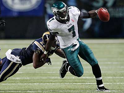 It was a nice blitz game plan by Rams head coach Steve Spagnuolo to get after Vick. He sent cornerbacks and safeties from Vick’s blindside and the Birds blocking didn’t make the adjustments to pick up the blitzer.