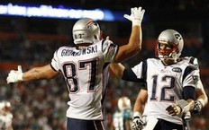 New England Patriots’ Rob Gronkowski (L) celebrates with quarterback Tom Brady after scoring a touchdown against the Miami Dolphins during the second quarter of their NFL football game in Miami, Florida September 12, 2011. REUTERS/Hans Deryk (UNITED STATES – Tags: SPORT FOOTBALL)