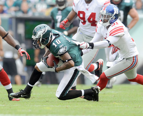 At the end of the game, Mike Kafka threw a deep pass his way and he’s didn’t give his best effort to breaking up the interception by Kenny Phillips.