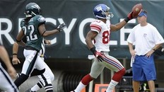 New York Giants wide receiver Victor Cruz, right, reacts as he scores a touchdown past Philadelphia Eagles cornerback Asante Samuel in the first half of an NFL football game on Sunday, Sept. 25, 2011, in Philadelphia. (AP Photo/Michael Perez)