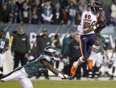 Chicago Bears wide receiver Earl Bennett (80) catches a pass under pressure from the Philadelphia Eagles cornerback Dominique Rodgers-Cromartie (23) during the third quarter of their NFL football game in Philadelphia, Pennsylvania, November 7, 2011. REUTERS/Tim Shaffer (UNITED STATES – Tags: SPORT FOOTBALL)