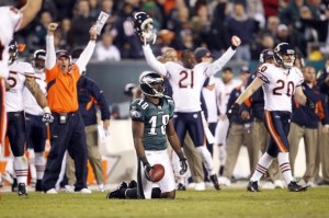 PHILADELPHIA – NOVEMBER 7: Wide receiver Jeremy Maclin #18 of the Philadelphia Eagles kneels on the ground after failing to make a first down that ended the game as the Chicago Bears celebrate a victory after a game on November 7, 2011 at Lincoln Financial Field in Philadelphia, Pennsylvania. The Bears won 30-24. (Photo by Hunter Martin/Philadelphia Eagles/Getty Images)