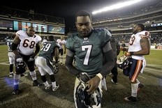 Philadelphia Eagles quarterback Michael Vick (7) heads off the field after an NFL football game with the Chicago Bears, Monday, Nov. 7, 2011, in Philadelphia. The Bears won 30-24. (AP Photo/Michael Perez)