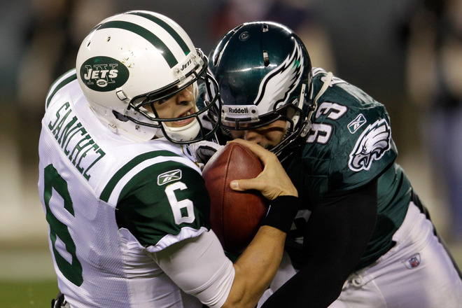 This played right into the hand of defensive end Jason Babin and the Eagles’ pass-happy defense. The former Titan recorded another three sacks, raising his total to 18 for the season. Howie Roseman signed the one-time first round pick to a huge deal this offseason to put pressure on opposing quarterbacks, and that is exactly what he has done. The journeyman is not just a typical down lineman, though. On one of his takedowns of Sanchez this week, Babin was in a standing position behind the defensive line at the snap.
