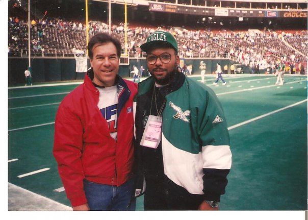 While working for WCAU in the mid 90’s I worked an Eagles game at Veterans Stadium. They were playing the Dallas Cowboys. As an employee I was trying to be professional but as a fan I was in my world, watching all the pre-game activity, players sprinkled about here and there and TV broadcaster standing around. I happened to see this guy with an NFL Films sweatshirt on under a red jacket, it was Steve Sabol.