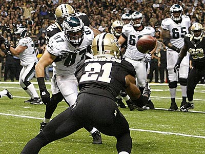 Celek was being covered by Saints safety Rafael Bush. The safety was grabbing and tackling Celek with the ball still in the air. The pass hit the tight end’s right hand as he reached up for it. The ball hit off his hand and went into the air. Saints cornerback Patrick Robinson was standing right there as he covered Eagles tight end Clay Harbor who was running an outside route.