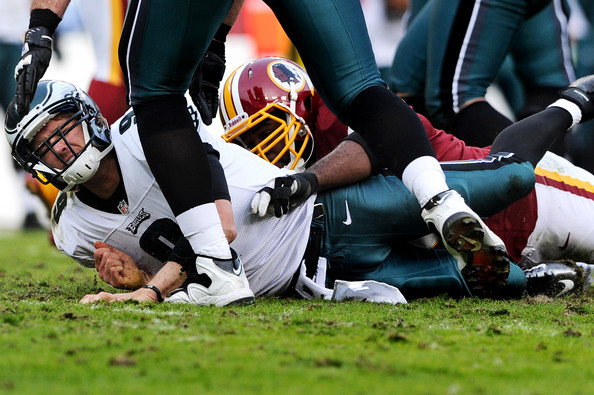 Foles made that same mistake earlier in the game when he had about ten seconds to find an open receiver. He rolled to his right and rolled to his right and rolled to his right. Eventually Redskins linebacker Ryan Kerrigan arrived, stripped him of the football. It was scooped up by Washington defensive back Richard Crawford, who could have returned it for a touchdown had Eagles rookie offensive tackle Dennis Kelly not been in the area.