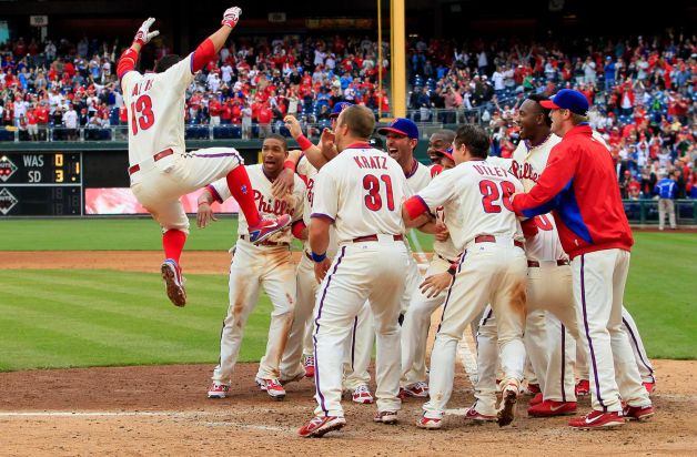 - In the bottom of the ninth, Delmon Young led off the inning with a walk. Cliff Lee was put into the game as a pinch-runner, and was picked off of first base. However, Erik Kratz and Freddy Galvis would hit back-to-back solo home runs to give the team the walk-off win.