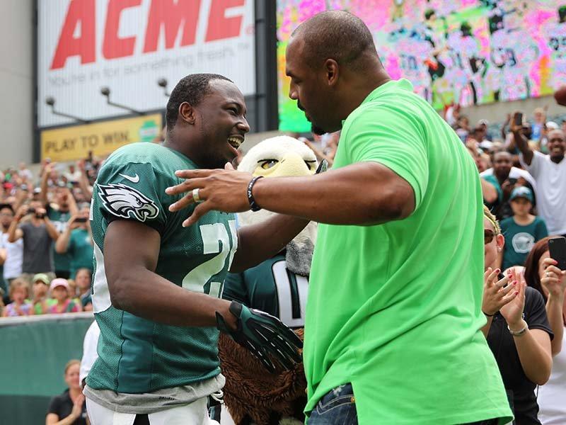 I had been introduced and was standing out on the field in the middle of all the other former Eagles players.  The current team had formed an aisle for us to walk through as we went onto the field.  I was giving out hugs and high fives to all the players who were already out there, but at the same time listening for McNabb’s name to be called.