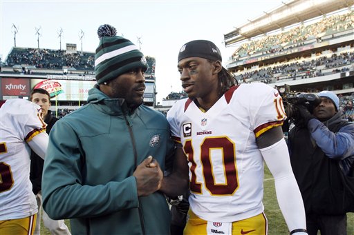 Michael Vick, Robert Griffin IIIYesterday Eagles quarterback Michael Vick and Redskins quarterback Robert Griffin III were tossing complimentary roses to each other with their interview comments.  Griffin was interviewed first and he talked about admiring Vick from afar, as a youngster.