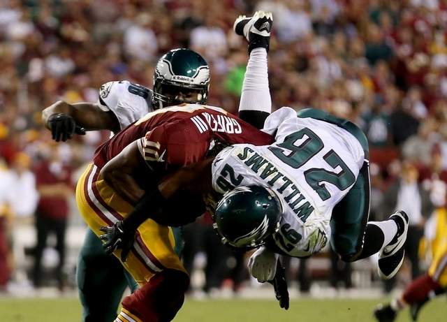 On another play, Eagles defensive coordinator sent him on a corner blitz and Williams tried to put his head through RGIII’s back, but the quarterback ducked.  Williams was still able to take him down, but if he had hit Griffin III the way he intended, the young QB wouldn’t be playing this weekend.
