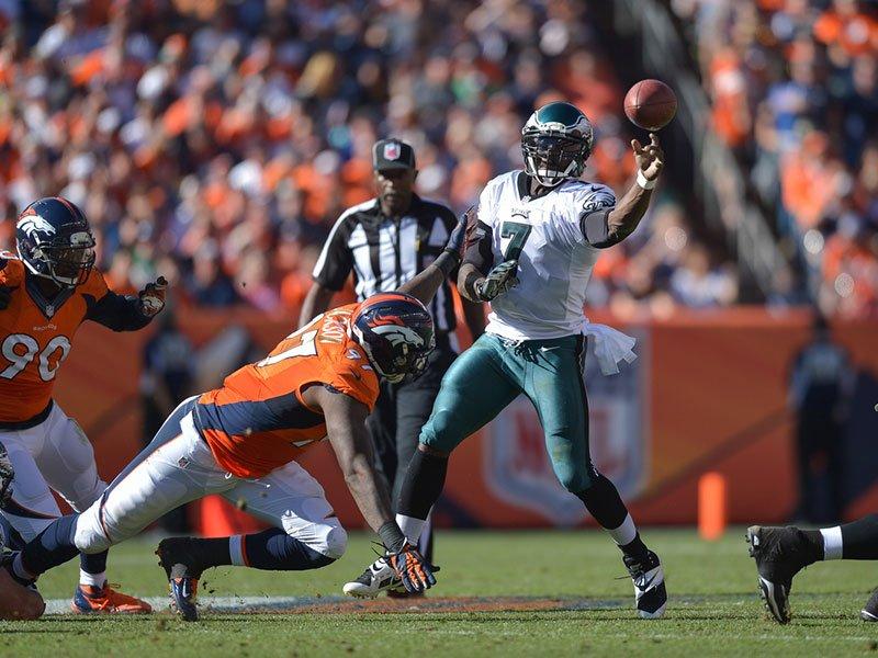 Right now the Eagles are having all types of trouble with their wide receivers and their offensive line because Jason Peters has a hand injury that’s not allowing him to play at the level we’ve been used to him playing at, and rookie Lane Johnson is learning the ropes and being taken to school. That Denver front seven was much better than I thought they were and they did a good job against the Birds offensive line.