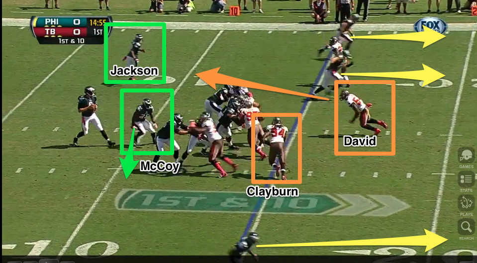 The only linebacker who could have possibly covered McCoy on the play was Adrian Clayburn who was lined up to rush the passer from the Eagles right side, but on the snap of the ball, he went to the left side of the formation and blitzed behind David. It was the worst defense to be in against the screen to the other side. The Bucs has all their linebackers blitzing to the Eagles left side as Foles and McCoy ran a screen to their right side.