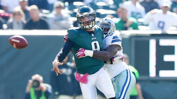 Nick Foles left the game in the fourth quarter, due to a head injury, 11 of 29 for 80 yards.  McCoy carried 18 times for 55 yards and did not have a run longer than 10 yards in the game. Jackson, who was shadowed most of the game by Brandon Carr, caught three passes for 16 yards. Philadelphia converted on only four of 22 third-down tries.