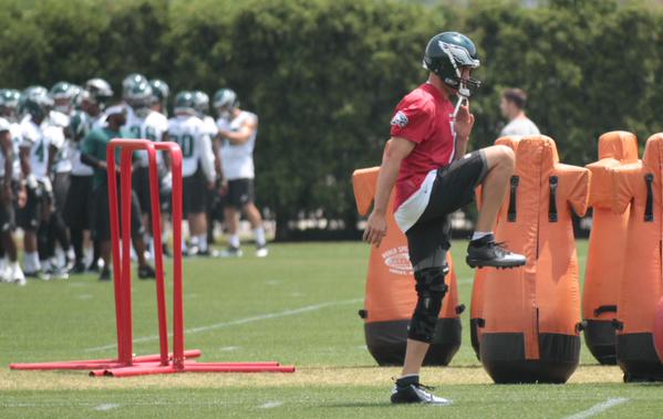 Eagles new quarterback Sam Bradford came out onto the Nova Care Complex field this afternoon and immediately started doing a high knee jog. The high knee drill is a way to strengthen the stomach muscles and hip flexors which allow you to raise your legs. I could see that he still needs to add more strength to his injured leg because he drags it a bit when he walks. That’s to be expected at this time in his recuperation process.