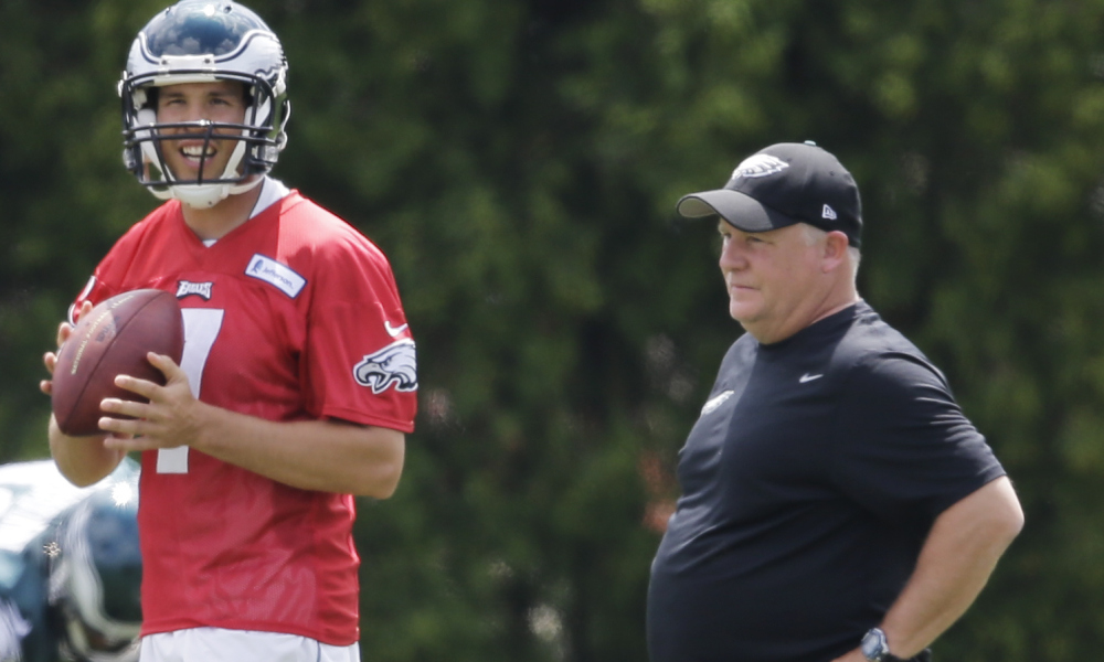 Philadelphia Eagles head coach Chip Kelly looks on as quarterbacks Tim Tebow (11) and Sam Bradford (7) pass during NFL football minicamp, Wednesday, June 17, 2015, in Philadelphia. (AP Photo/Matt Rourke)