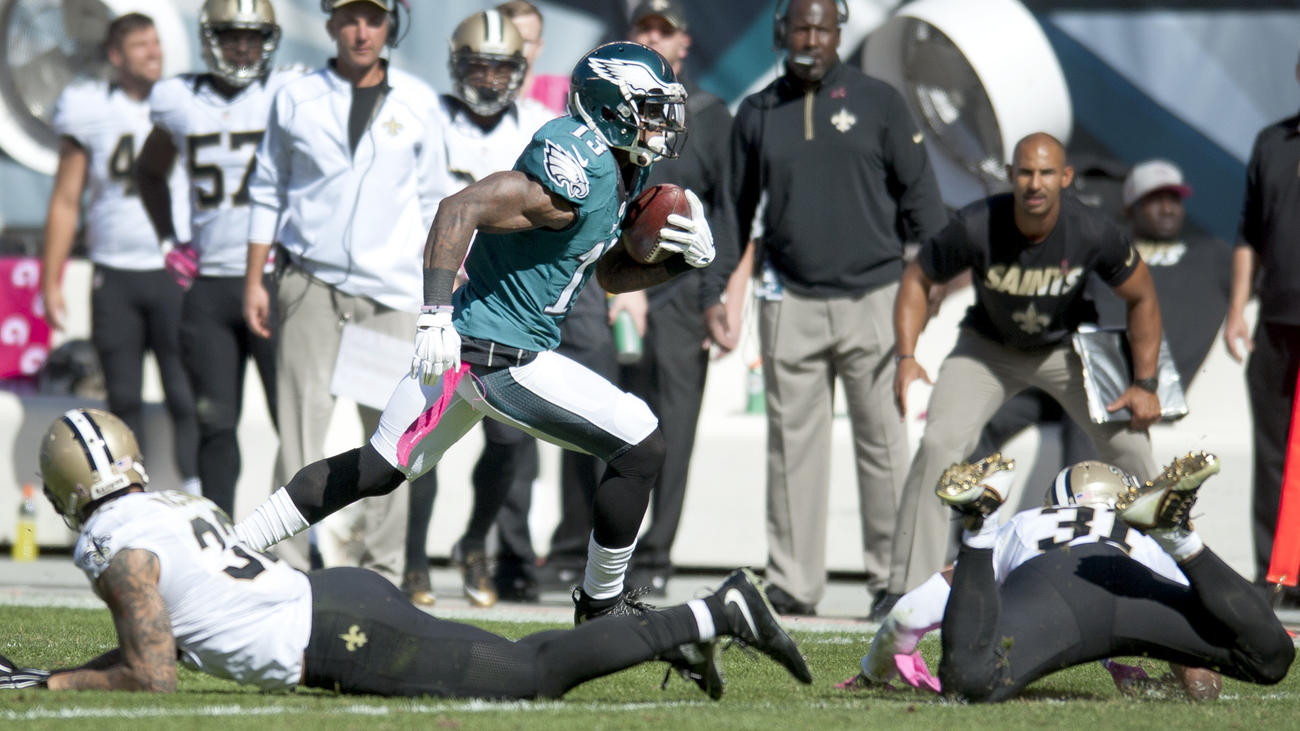 Bradford spread his throws out to all of his receivers. Josh Huff has four catches for 76 yards with one touchdown. On his touchdown catch, two of the Saints defenders ran into each other as Huff ran uncontested into the end zone. They need Huff to step up because rookie Nelson Agholor might miss some time with an injured ankle.
