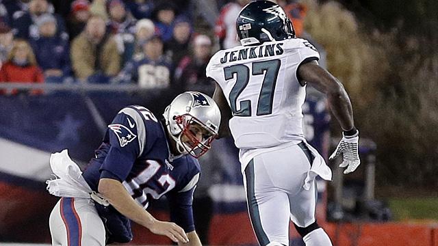 Philadelphia Eagles safety Malcolm Jenkins runs past a tackle attempt by New England Patriots quarterback Tom Brady (12) with a 100-yard interception return for a touchdown during the second half of an NFL football game, Sunday, Dec. 6, 2015, in Foxborough, Mass. (AP Photo/Steven Senne)