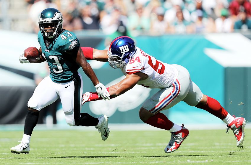 PHILADELPHIA, PA – SEPTEMBER 24: Darren Sproles #43 of the Philadelphia Eagles carries the ball as Olivier Vernon #54 of the New York Giants defends on September 24, 2017 at Lincoln Financial Field in Philadelphia, Pennsylvania. (Photo by Elsa/Getty Images)